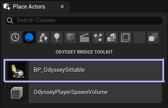 The basic tool to use to integrate the sitting functionality into a project is by using the BP_OdysseySittable blueprint actor. To add an Odyssey Sittable to your level: