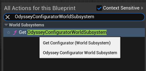 Inside your level blueprint, on BeginPlay, grab reference to the OdysseyConfiguratorWorldSubsystem: