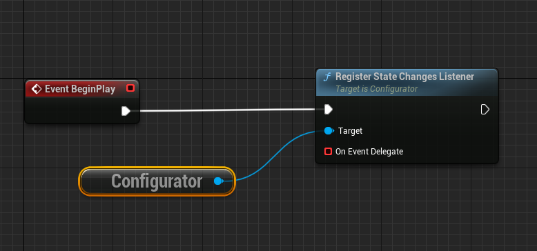 Off of the new Configurator node, create a Register State Changes Listener and connect it to your Event BeginPlay: